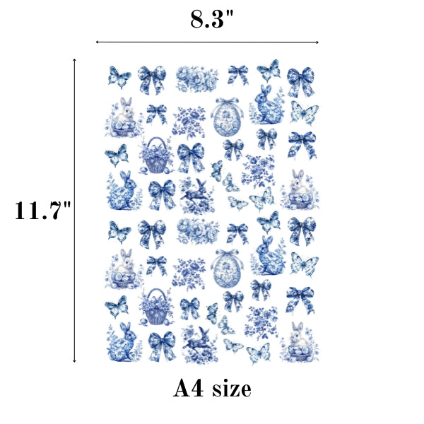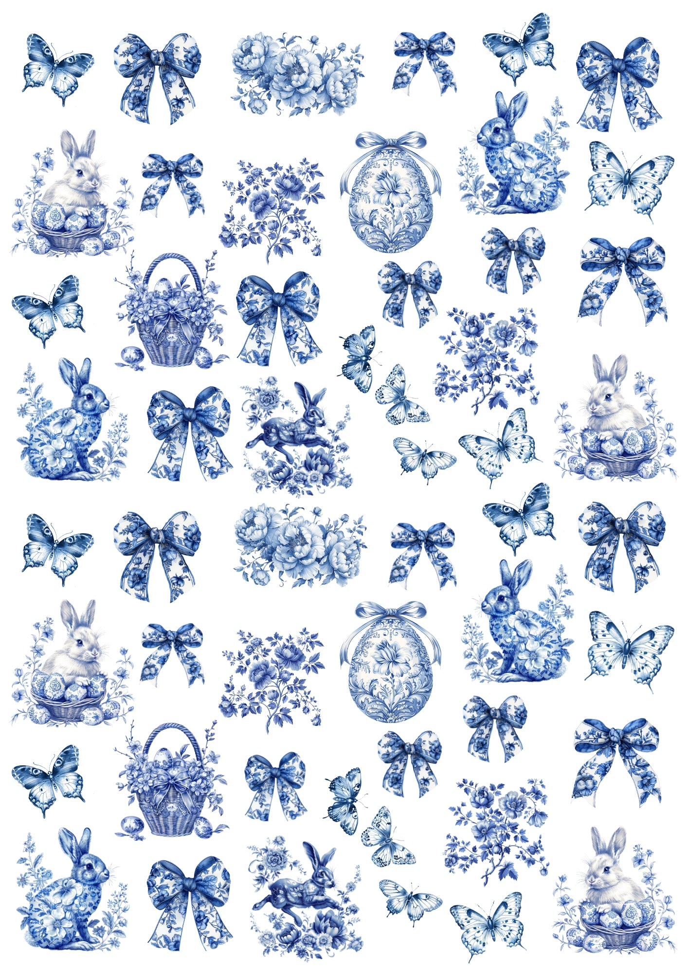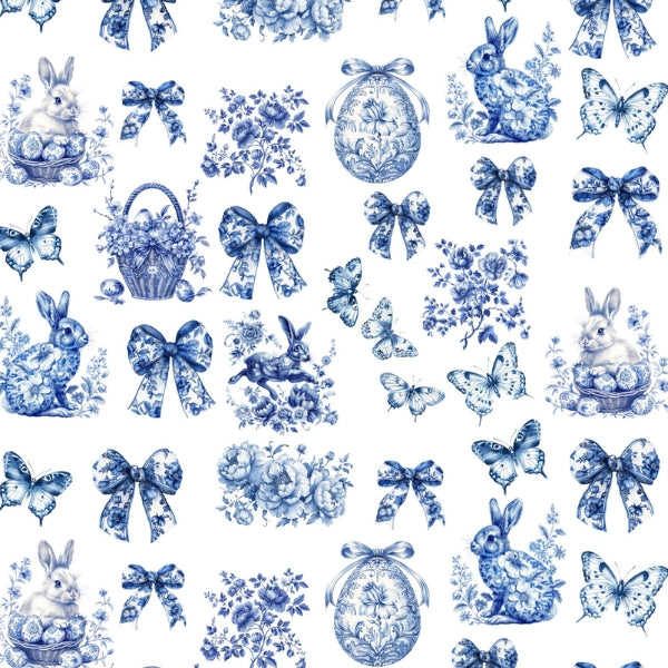 This elegant collection features vintage-style blue illustrations, including Easter bunnies, floral bows, butterflies, decorated eggs, and classic porcelain-inspired motifs — perfect for soft, timeless spring décor.